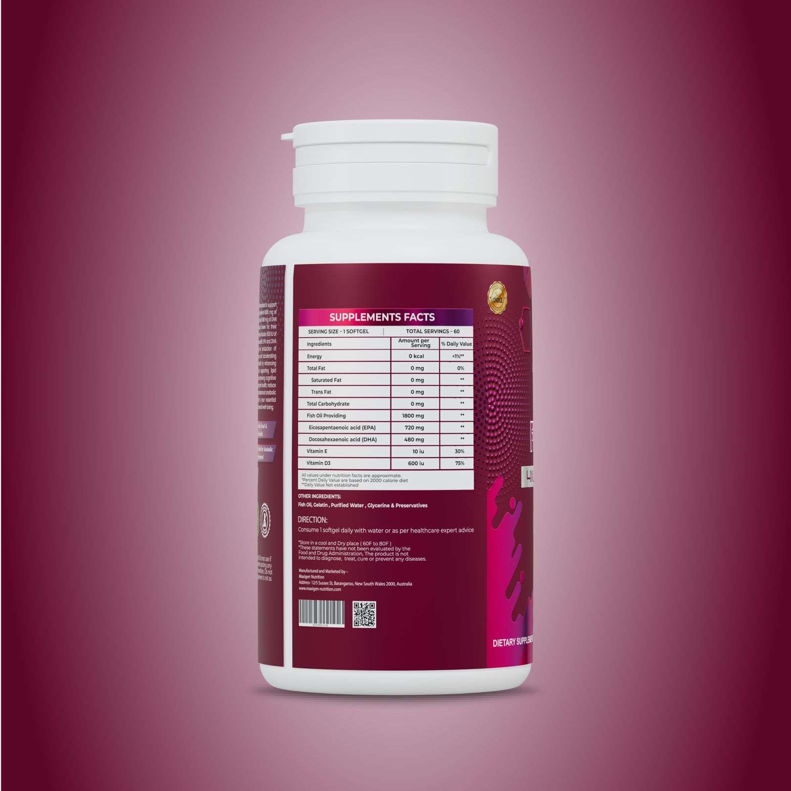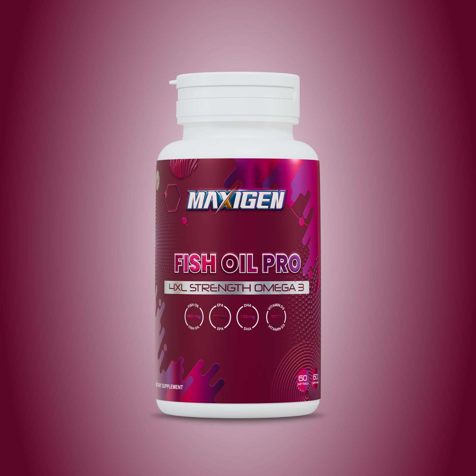 Maxigen Nutrition brings you its most advanced omega-3 supplement to date — Fish Oil Pro – 4XL Strength Omega-3. Specifically designed for athletes, bodybuilders, and high-performance fitness enthusiasts, this is not your average fish oil. With an industry-leading 1800 mg of pure fish oil per serving, including a whopping 720 mg EPA, 480 mg DHA, and 600 IU Vitamin D3, Fish Oil Pro delivers 4X the strength of standard omega-3 supplements — all in one convenient softgel.
