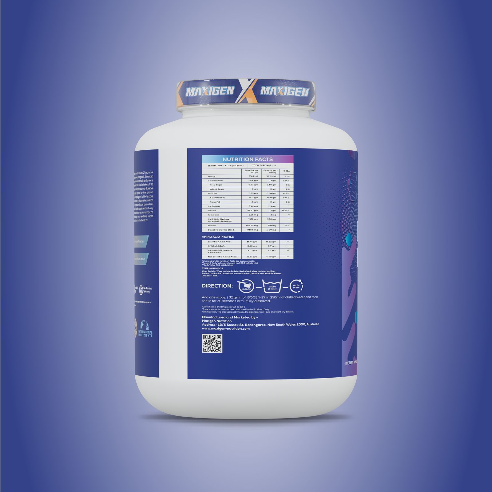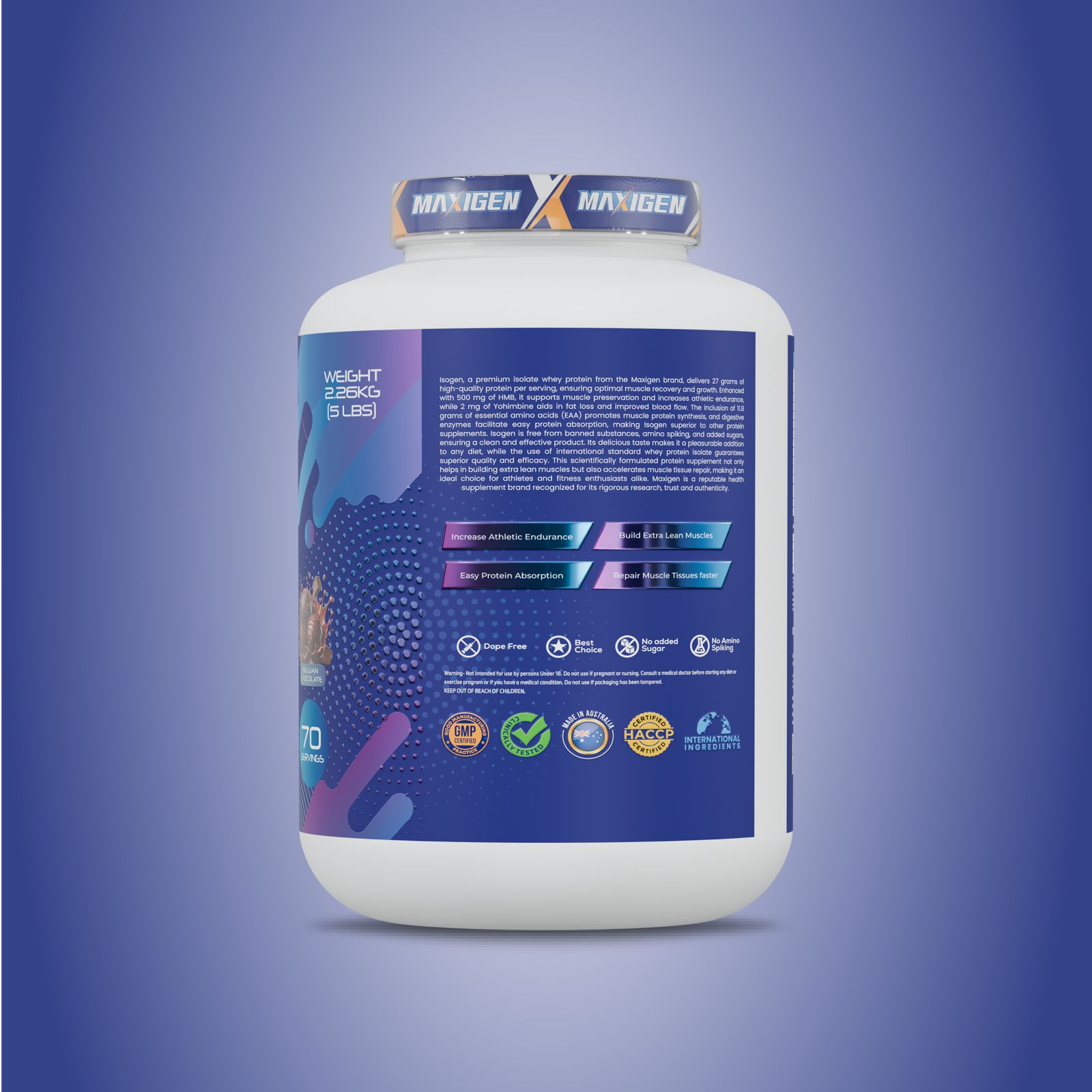 Unlike blends that spike protein content with hidden ingredients, Maxigen Nutrition guarantees full-label transparency, third-party testing, and internationally sourced raw materials. We ensure every scoop of Isogen-27 is GMP-certified, FDA-compliant, HALAL-certified, and free from banned substances — trusted by athletes, backed by science.